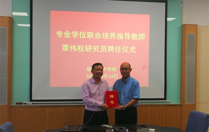 来访期间,学院举行了专业学位联合培养指导教师聘任仪式,聘任覃伟权研究员为成人色情 专业学位联合培养指导教师。双方表示愿意在专业实践基地建设、科研推广与人才培养等方面开展全方位的合作交流。